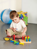 An intriguing board with 25 bright coloured Cylinders in different heights. Good for hand/eye co-ordination and basic skills.