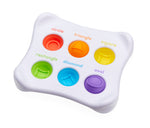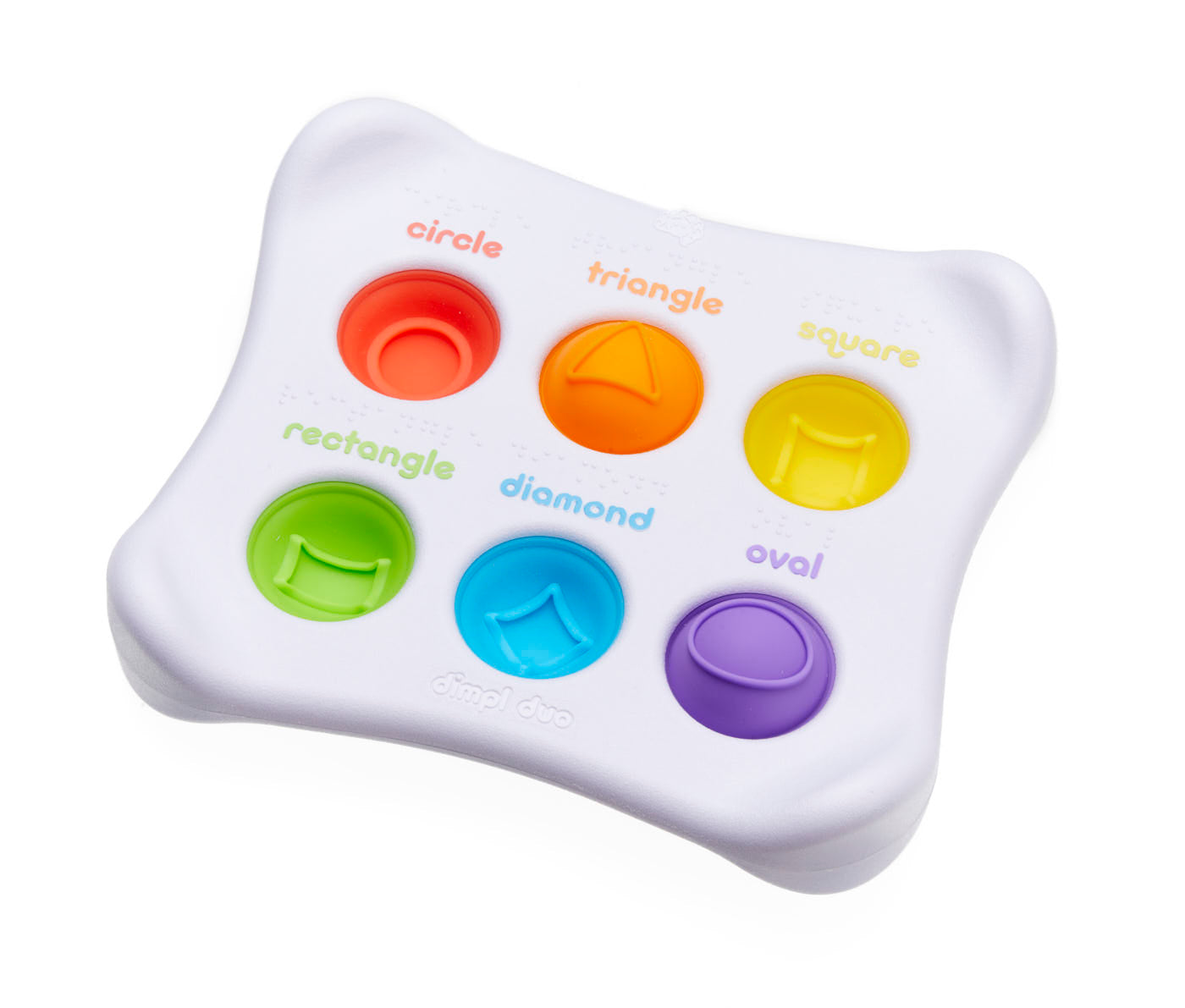 On one side, each silicone button is emobssed with a different shape and labelled with its matching word in English and in Braille.