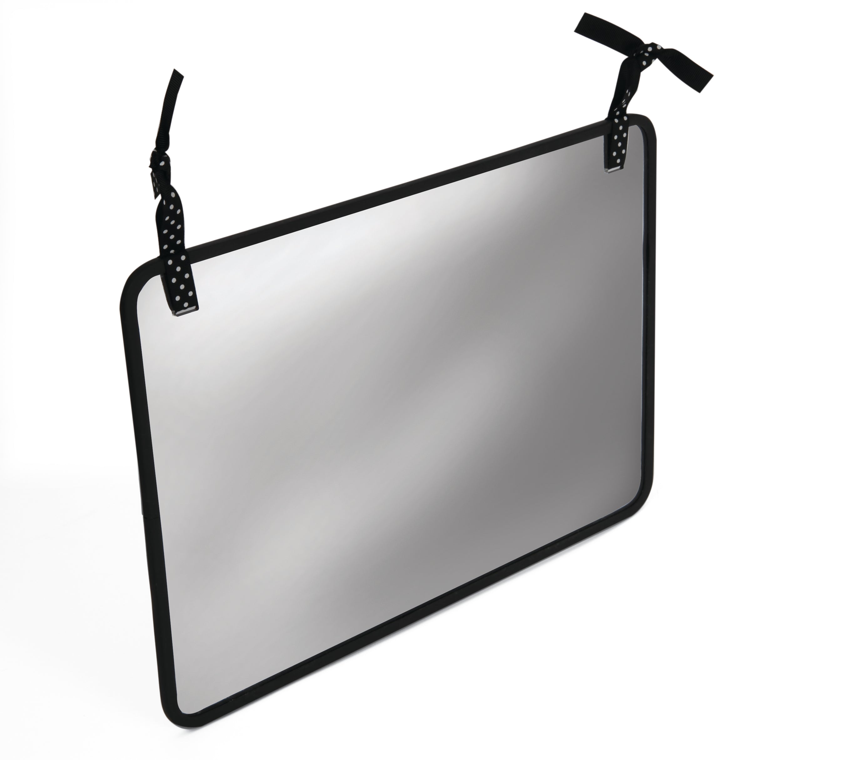 One side features a mirror for self-discovery while the other side has a high contrast black and white graphics that help build visual and multi sensory development.