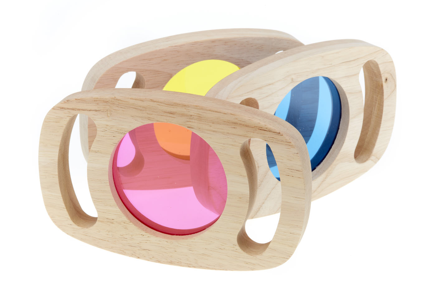 Set of 3 transparent coloured acrylic sheets (red,blue and yellow) sealed inside hardwood frames with easy grip handles.