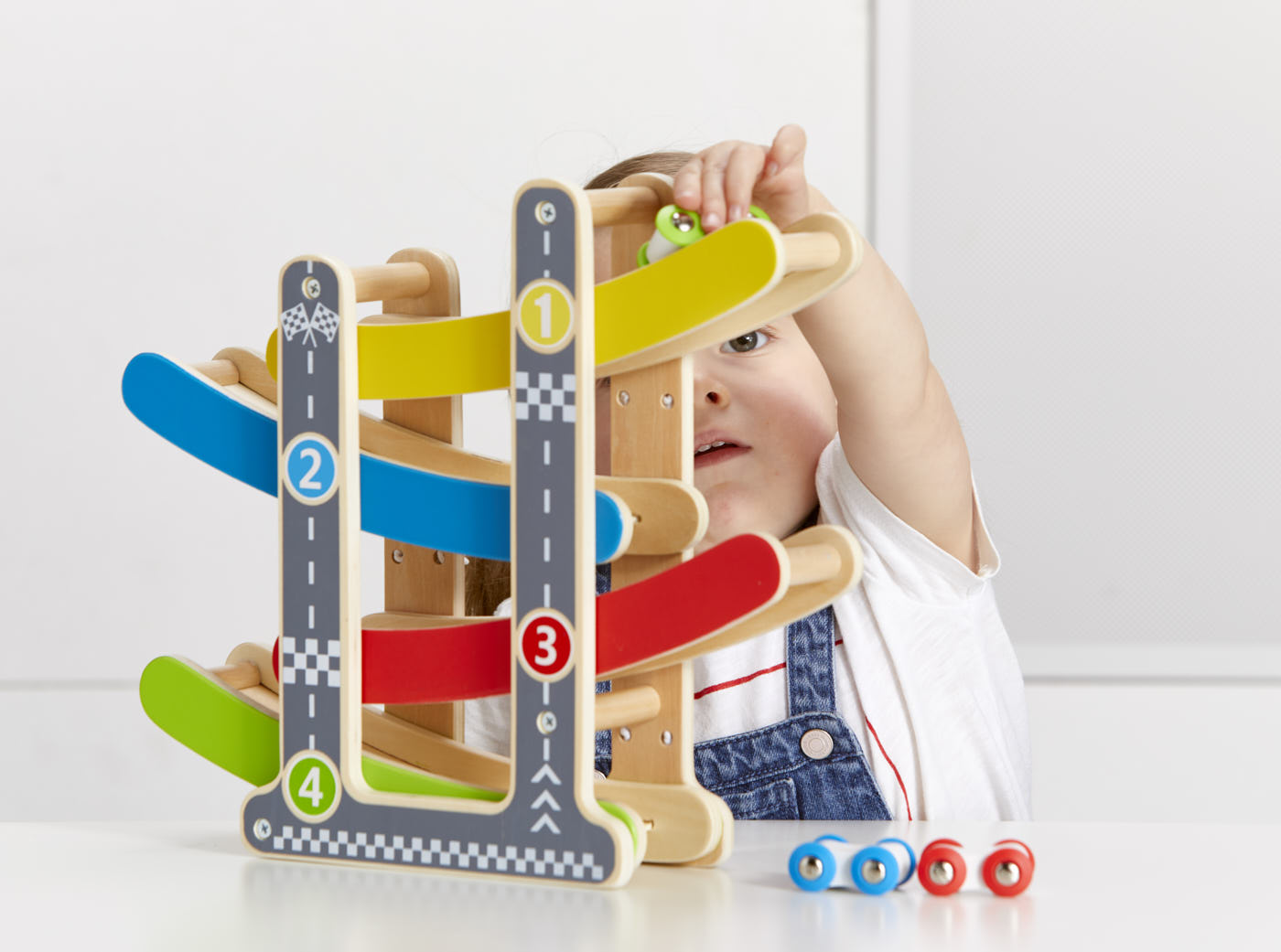 Watch your cars race and flip over one another as they come racing down the beautiful crafted wooden track.