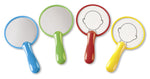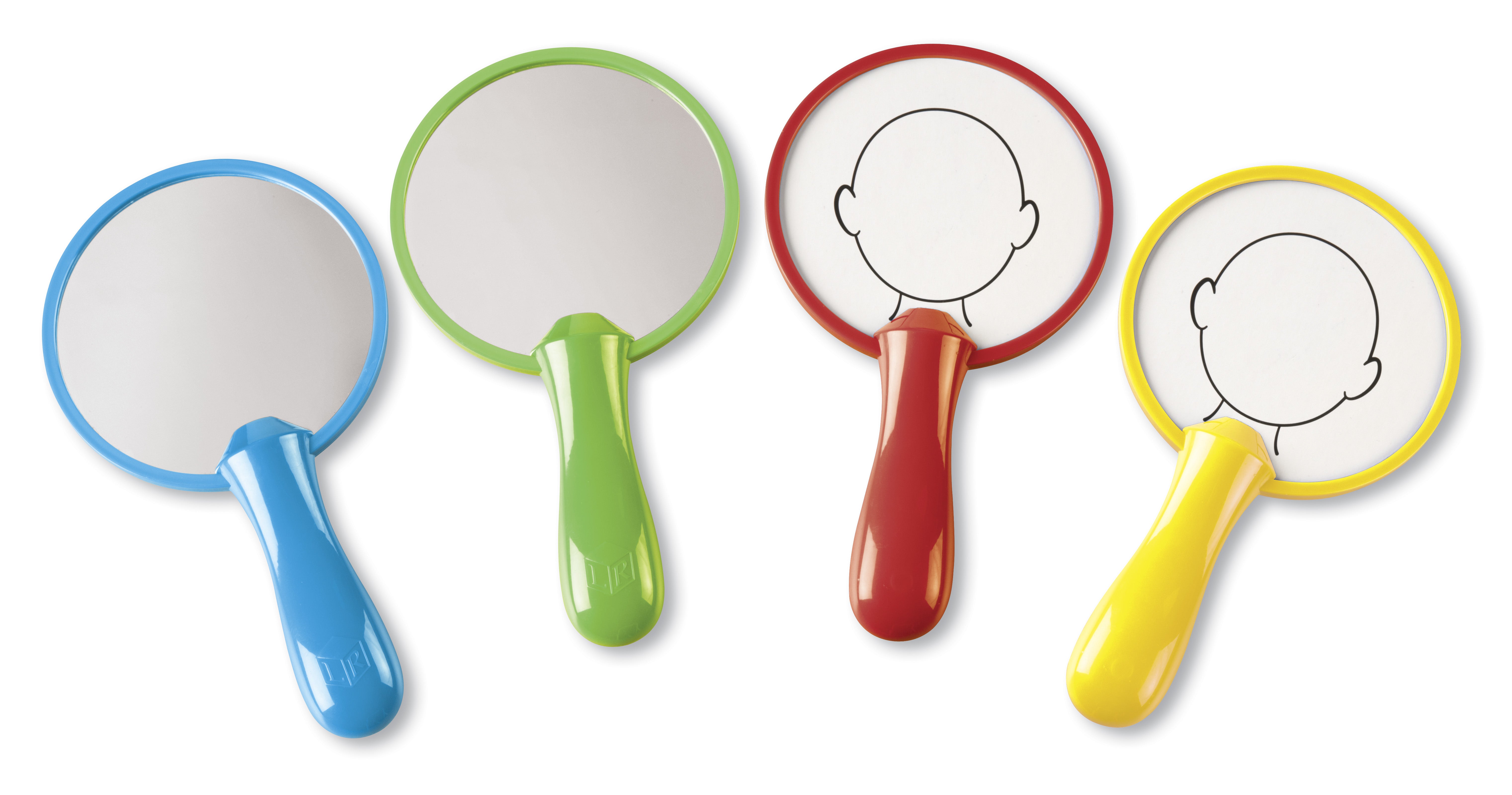 A set of four easy to hold mirror boards, with a see-yourself mirror on one side and a write and wipe white board on the reverse. Draw yourself making it "All about me". Encourages both awareness and aid speech and language development.