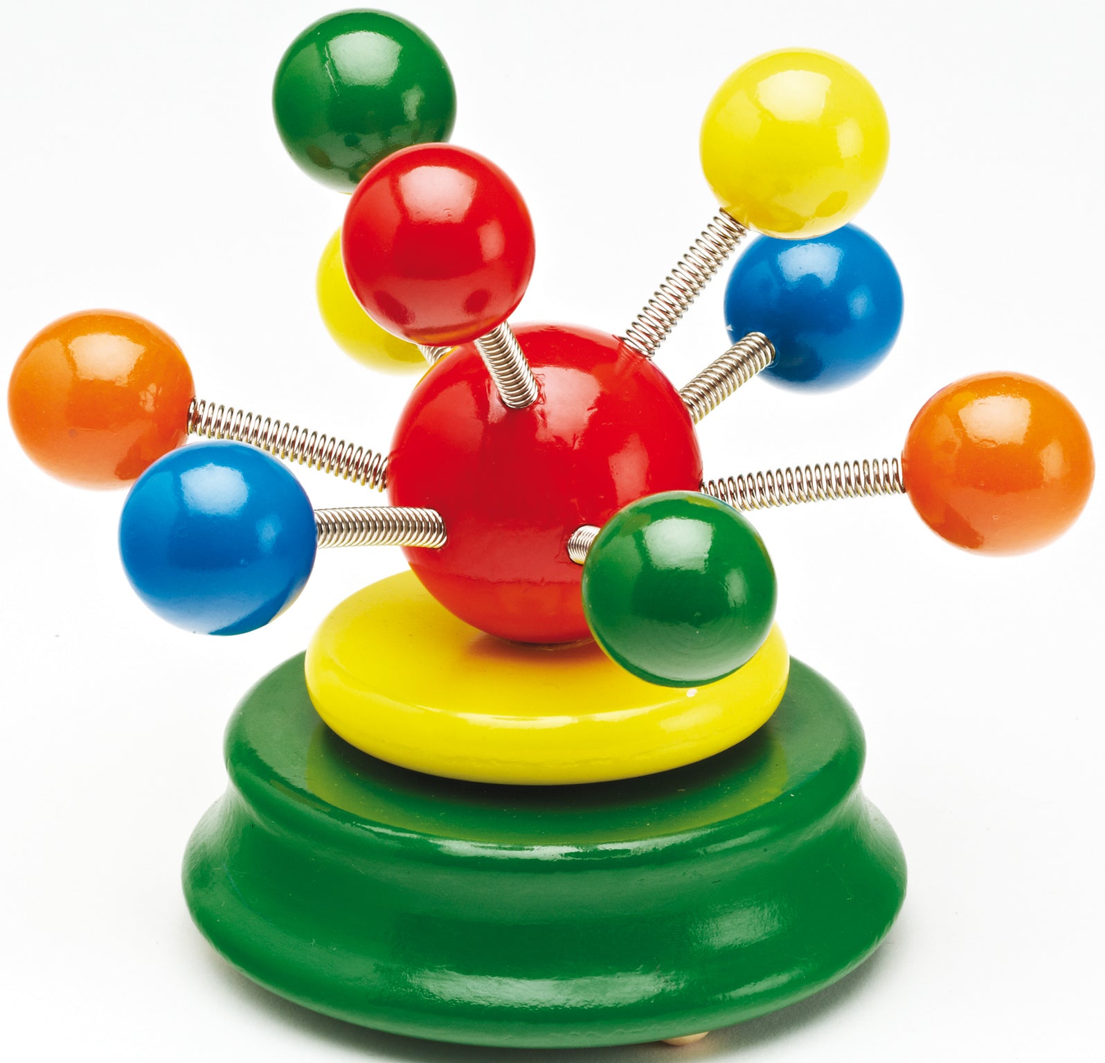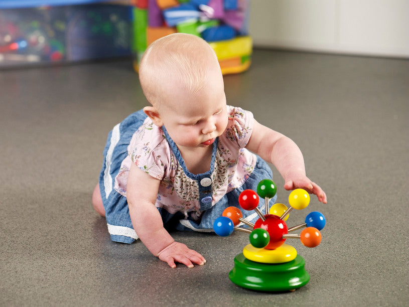 The musical fantasy roundabout is a hand-painted musical toy which plays a soothing melody when wound-up. The coloured balls rotate on their springs as the melody plays, creating an audible and visual reward whilst encouraging touch.