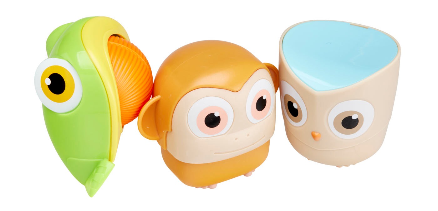 Wonderful sounds can be created by blowing in the top of the Owls Whistle, rubbing Frog's tummy, and pressing Monkey's head.