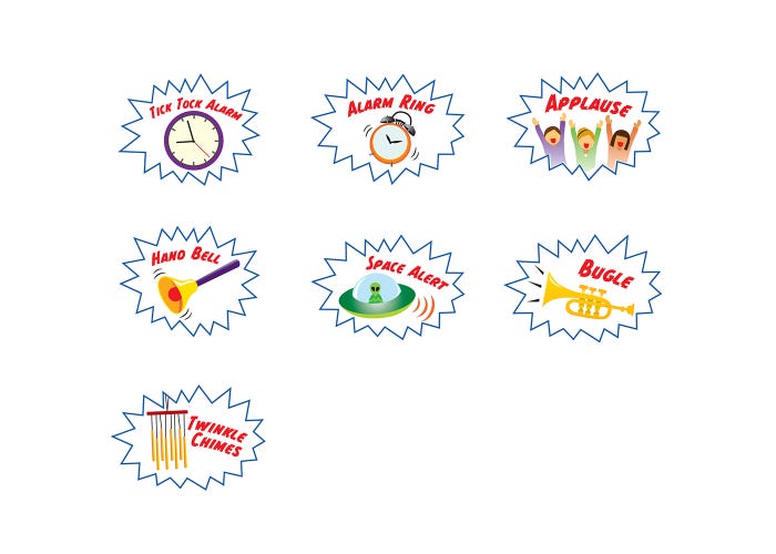 - seven different sounds; tick tock, hand bell, alram, magic wand, applause, laser and trumpet