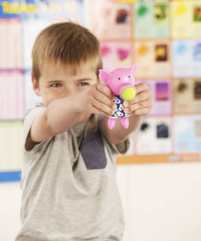 This soft mallable Pig is easy to grip encouraging you to squeeze gently to be rewarded with a soft foam ball which flies out of the Pigs mouth.