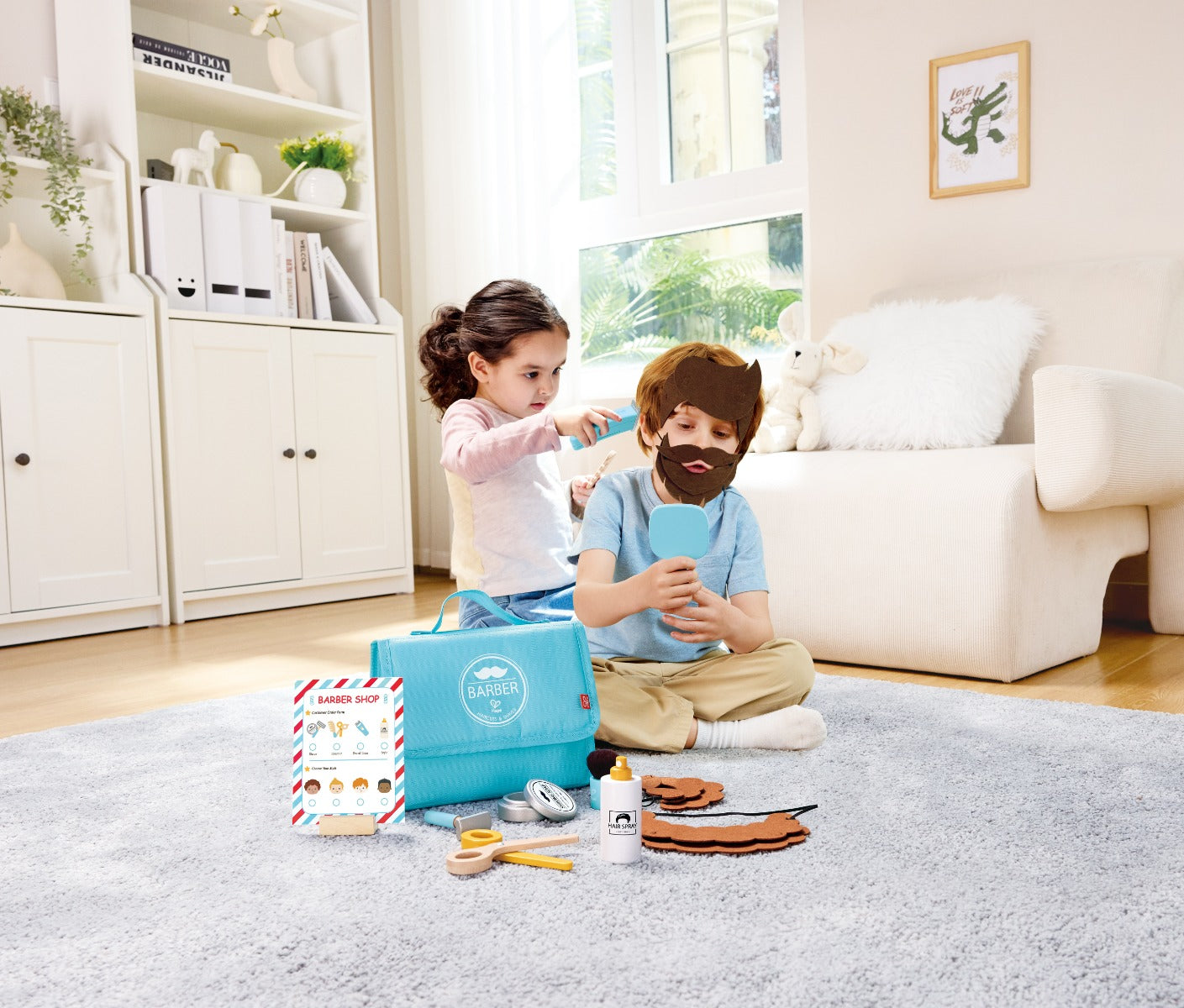 • Complete salon tools including electric clipper with realistic sound and vibration, shaver, comb, styling brush, scissors, razor, soap box, hairspray bottle
