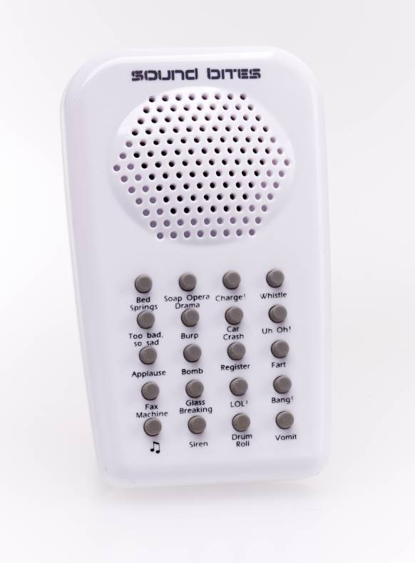 A noisy machine with twenty practical sounds for every occasion like glass breaking, burps, applause, drum roll and many more. Studio quality sound effects.
