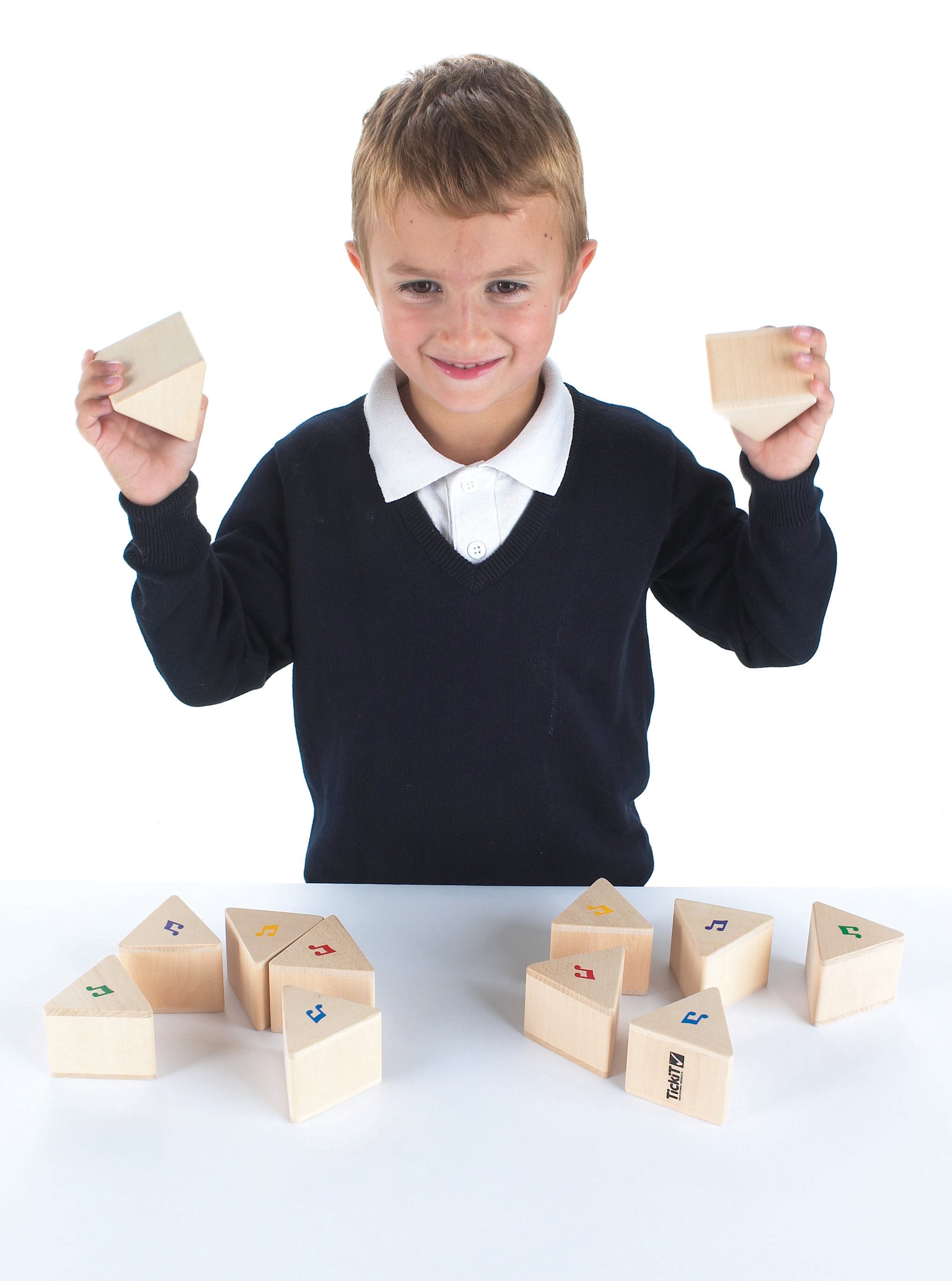 Six pairs of wooden triangular prisms, identifiable by matching colour musical notes. Shake the prisms to match up to six pairs encouraging observation using their listening skills.