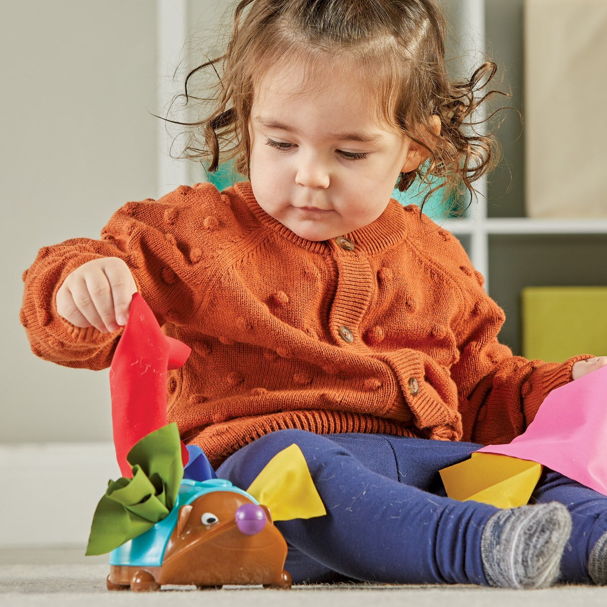 Look inside Spikes shell and discover colourful fabric tissues that are ready for fine motor fun!