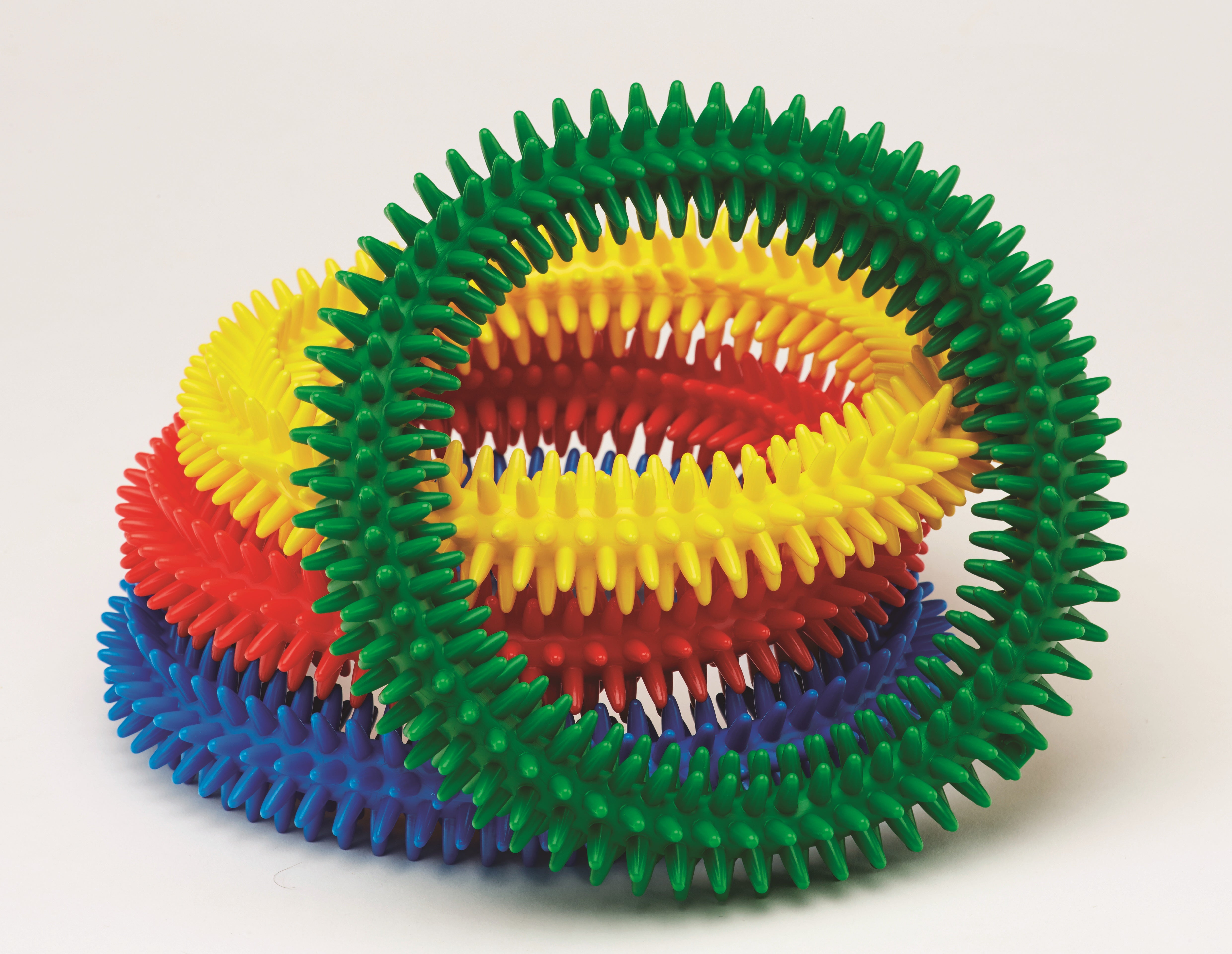 A set of four flexible tactile spiky rings that are easy to hold, throw or catch. Ideal for activity games as well as a touchy fidget.
