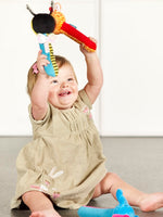 Squeekaboos have 3 noisy rewards. Shake to hear jingle bells, squeeze to make them squeak and massage for the crinkle effect.