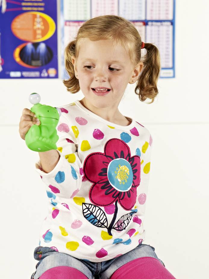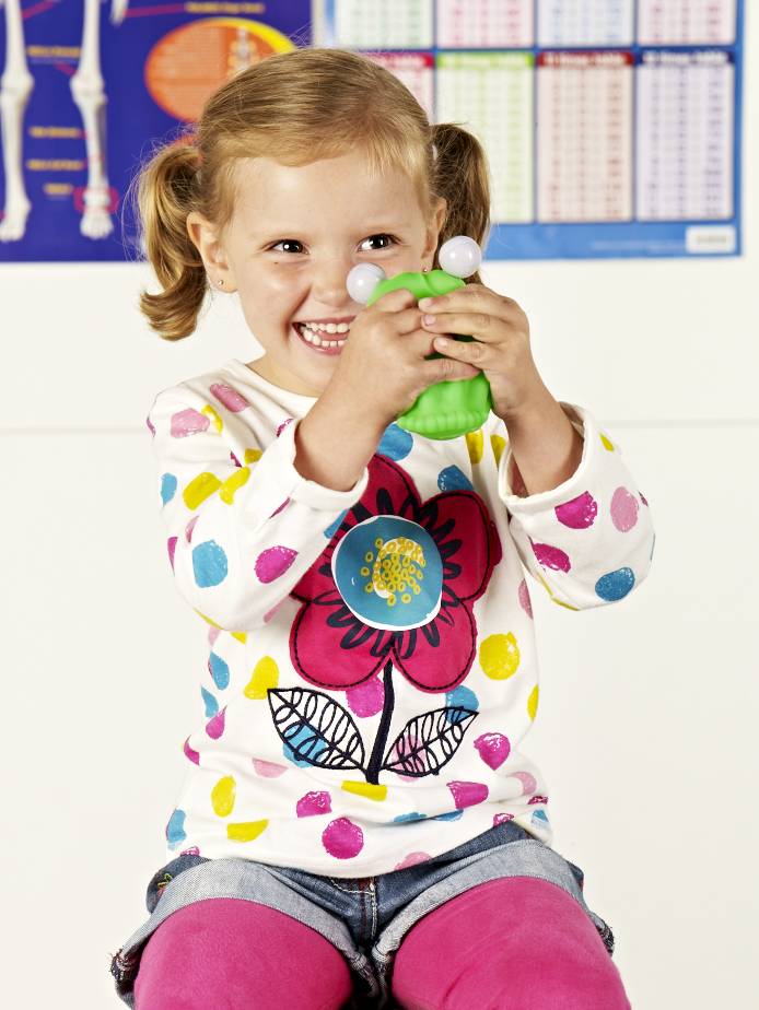 Squeeze the frog to make one of its floating eyes pop out followed by the other. A good visual reward for your effort. Encourages squeezing and control.