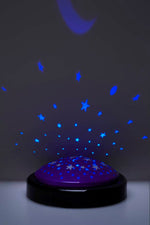 The top has shaped holes that sit above a light, allowing it to shine through the gaps and makes stars and a crescent moon appear on the surface above the projector.