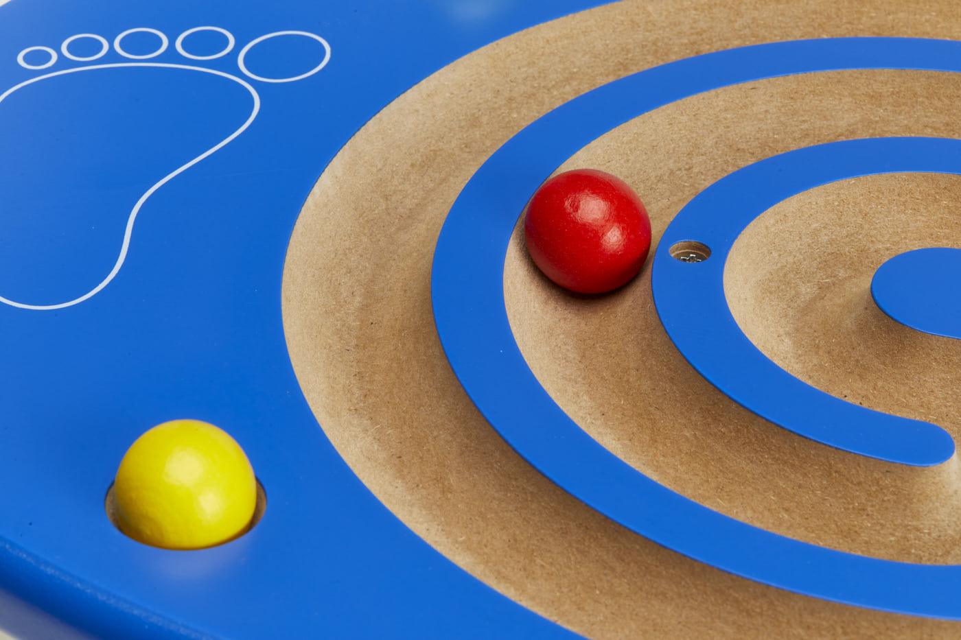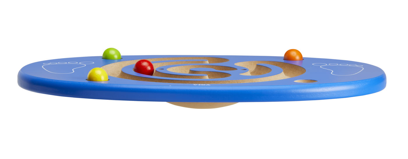 By standing on the board and placing their feet in the foot prints, children should use their balance and core muscles to roll the ball through trail paths.